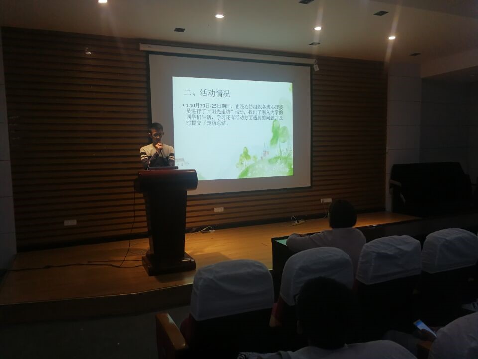 首先陈荟芳老师讲话,阐述了心理健康的重要性,通过以往的事例进一步明确心理保健员的工作职责。接着陈荟芳老师对心理保健员进行培训,要求心理委员同团支书班长配合,关注班里同学的心理动态,发现有异常的同学要即时向辅导员汇报情况,强调心委要与本班同学搞好关系,善于倾听同学的声音。再接着各年级心理部部长通过PPT展示对2017年度上半期心理部开展的工作、取得的成效、调查的结果进行汇报总结,同时对前期的工作进行总结性反思,并对后期将要开展的工作进行进一步的规划。最后,陈荟芳辅导员对部长的总结汇报进行点评。