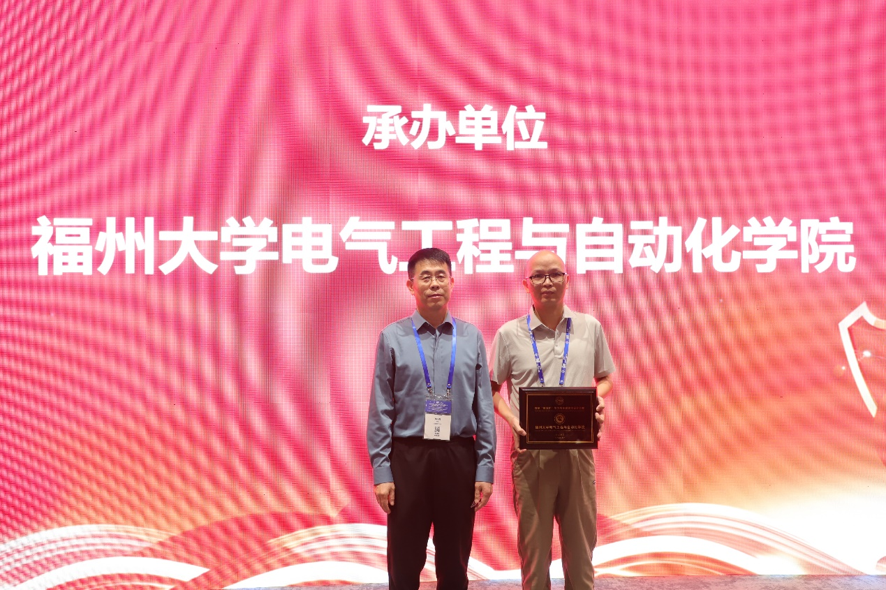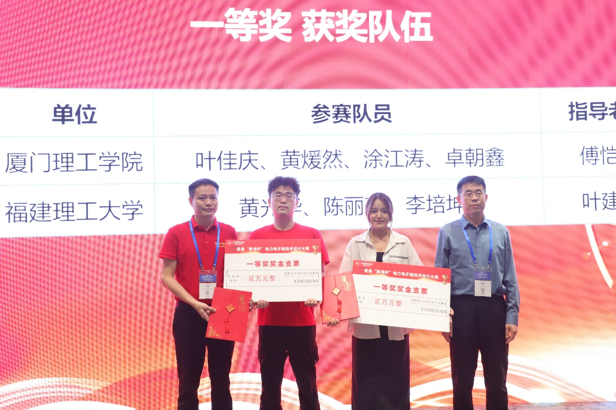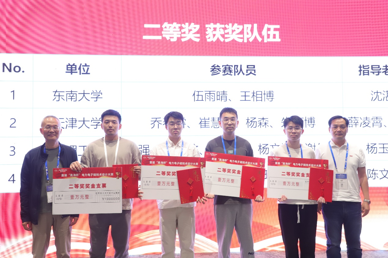 在颁奖环节,中国电源学会磁技术专委会主任委员太原理工大学杨玉岗教授和奥海科技郭修根副总裁给一等奖获奖队伍颁奖。