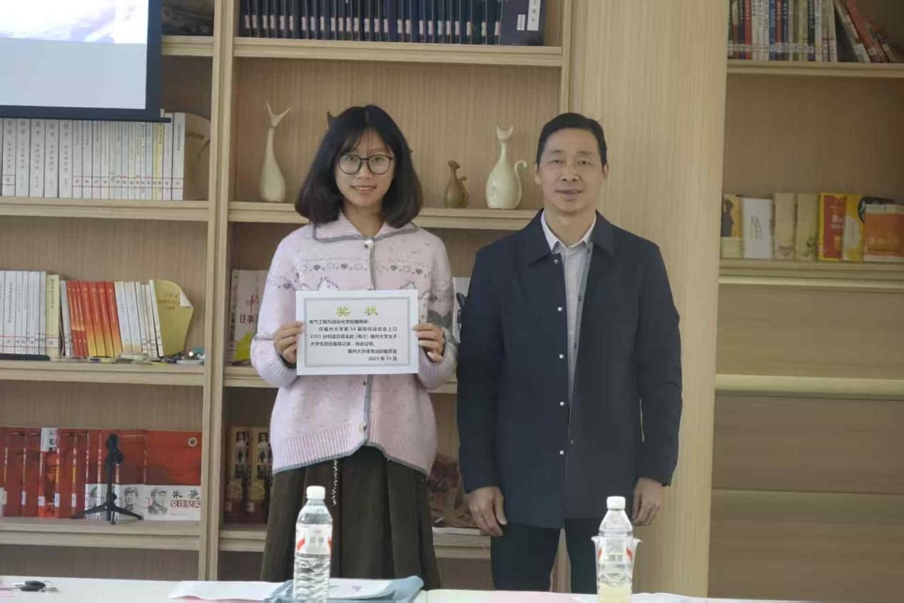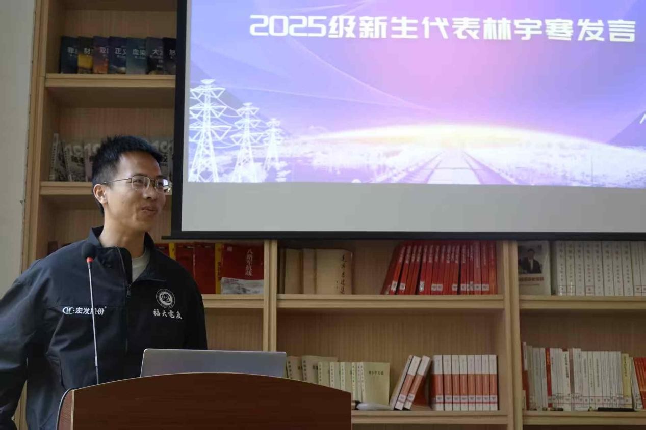 2025级新生代表林宇寒表示很荣幸代表铜盘的同学上台发言,第一次参与福大的校运会,他感受到了来自领导,老师,学长学姐的关怀。他代表铜盘的同学承诺,要积极参与训练,为明年重得冠军做出努力。