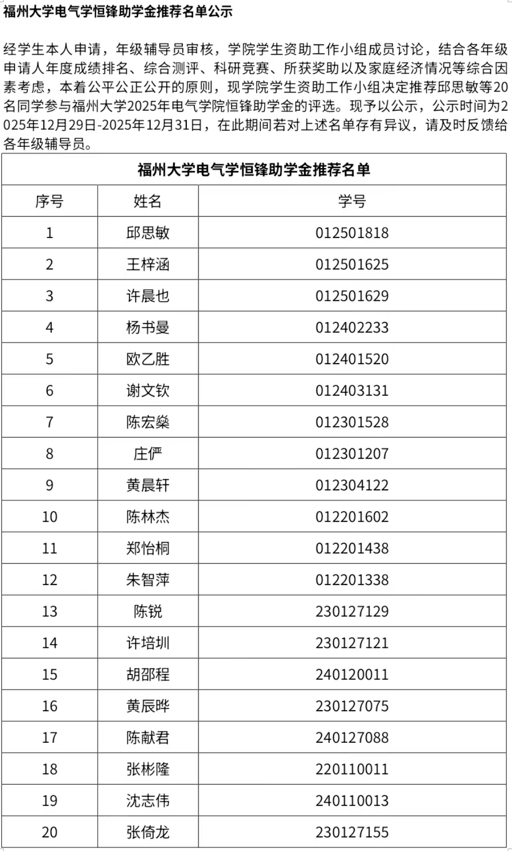 91色情 电气学恒锋助学金推荐名单公示