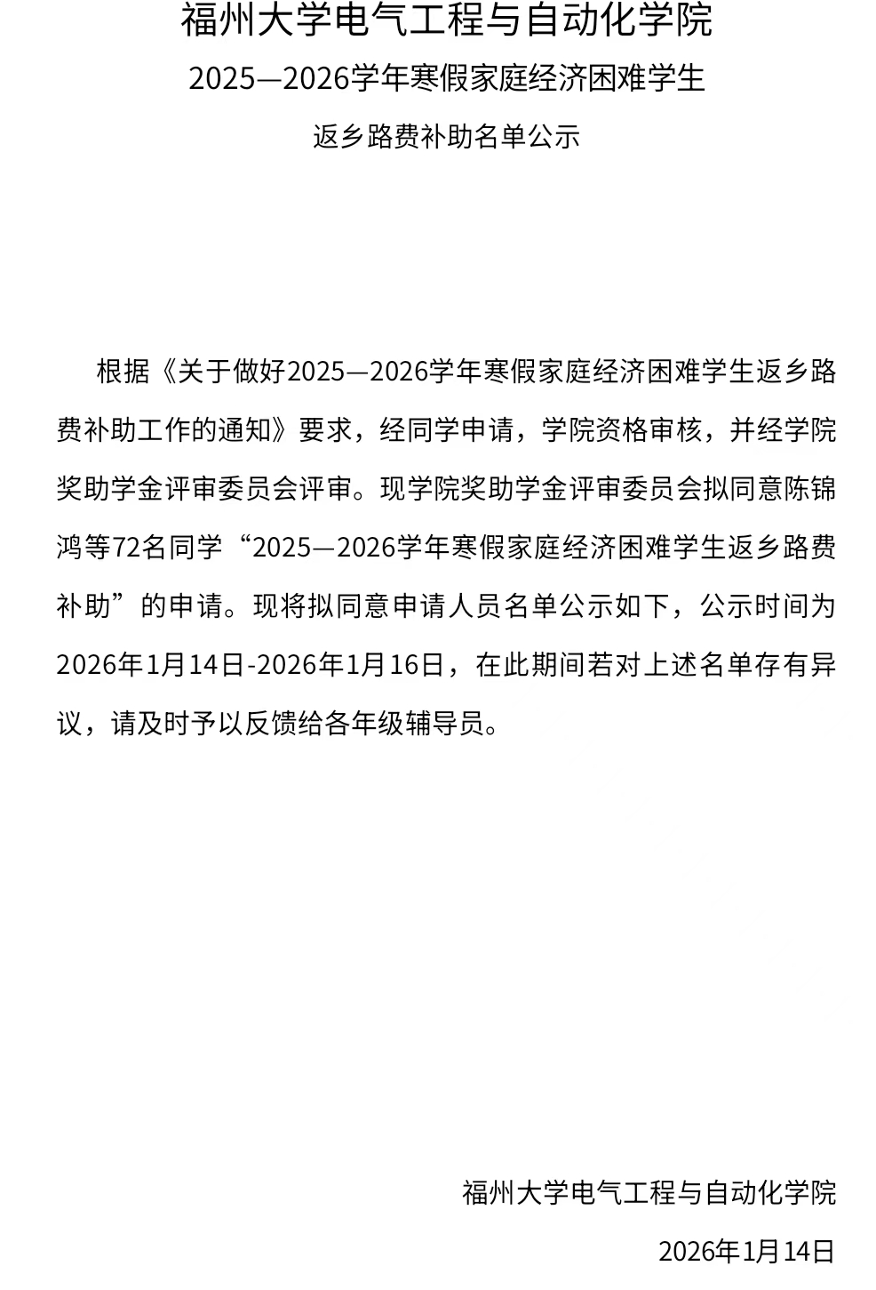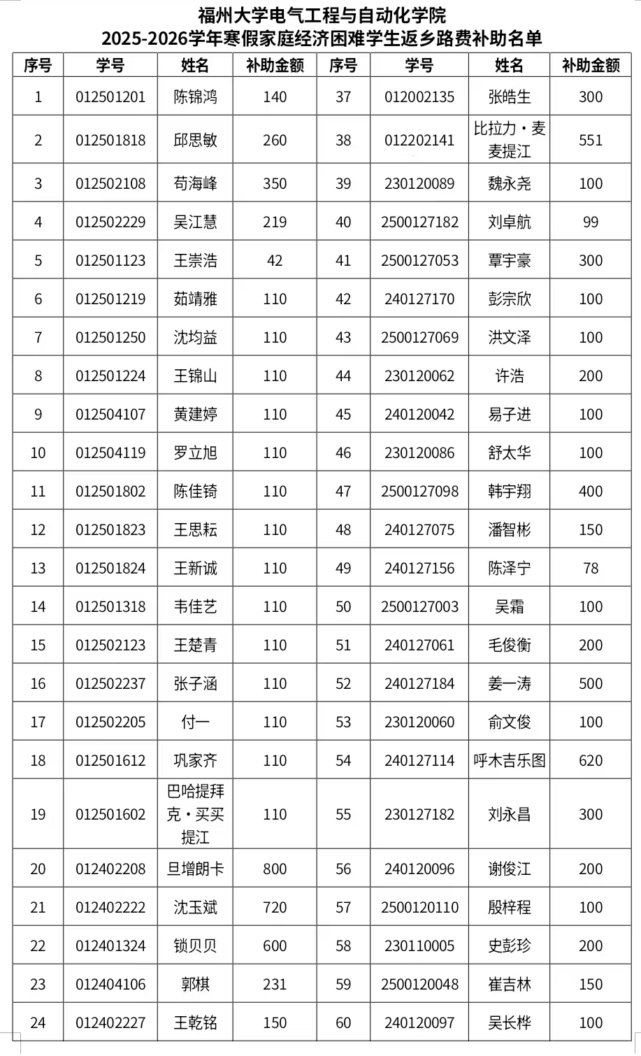 91色情 2025—2026学年寒假家庭经济困难学生 返乡路费补助名单公示